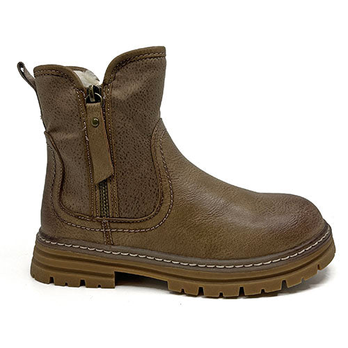 Dejlig 5th Avenue vinterstøvle med en overdel af imiteret glat skind og tekstil med en pyntelynlås på ydersiden af anklen. Støvlen lukkes med en lynlås på indersiden af anklen, og en trækfane bagpå gør det nemt at træde i støvlen. Indvendig har støvlen et blødt, lunt fleecefoer, og den udtagelige indersål er blød. Den kraftige og godt mønstrede gummiydersål er stødabsorberende med et godt vejgreb.
