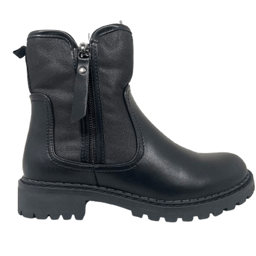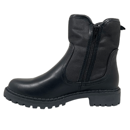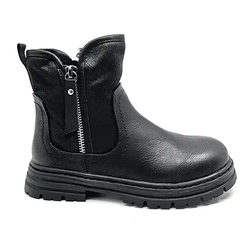 Dejlig 5th Avenue vinterstøvle med en overdel af imiteret glat skind og tekstil med en pyntelynlås på ydersiden af anklen. Støvlen lukkes med en lynlås på indersiden af anklen, og en trækfane bagpå gør det nemt at træde i støvlen. Indvendig har støvlen et blødt, lunt fleecefoer, og den udtagelige indersål er blød. Den kraftige og godt mønstrede ydersål er stødabsorberende med et godt fodfæste.