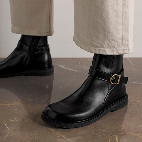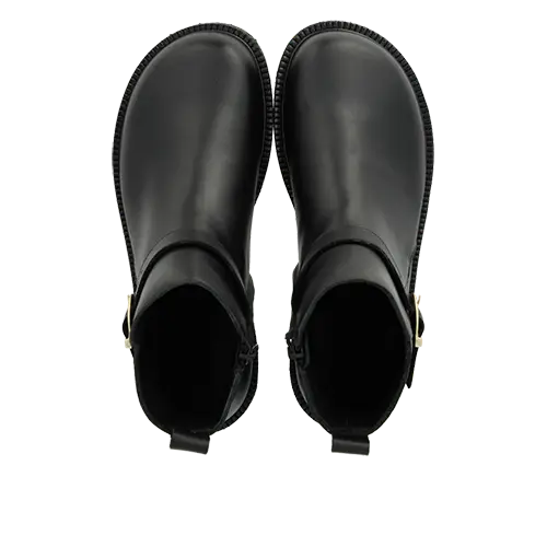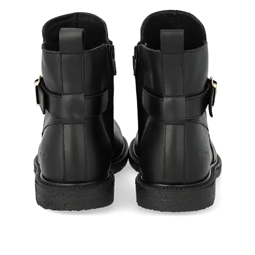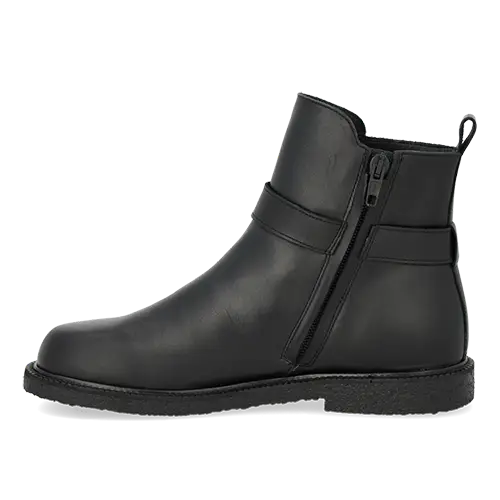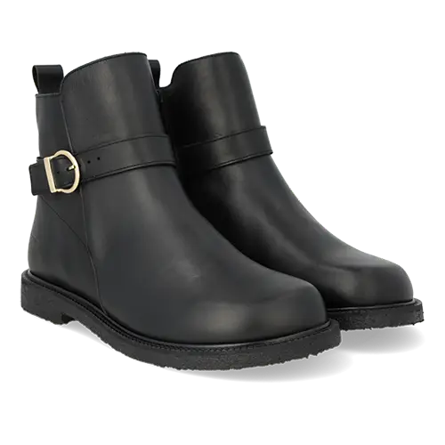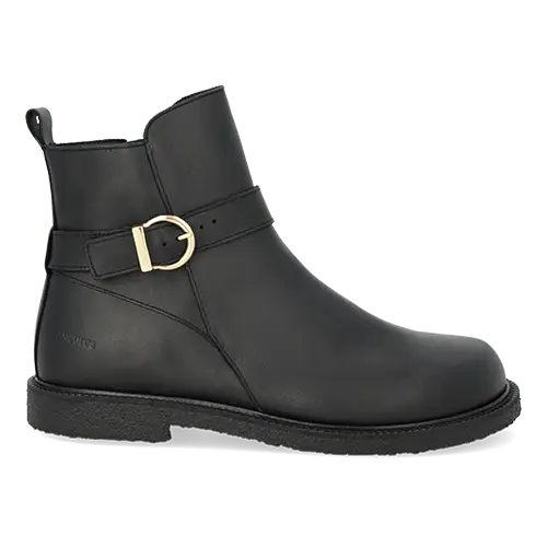 Lækker ankelstøvle med en overdel af glat skind med rund snude og en rem om anklen med et justerbart, guldfarvet spænde. Støvlen lukkes med en lynlås på indersiden af anklen og har en trækfane bagpå. Indvendig har støvlen et kromfrit skindfoer, så fodklimaet er optimalt. Støvlen er ekstra rummelig om forfoden. Indersålen er komfortabel, og den FSC-certificerede rågummisål med dekorativ rand er blød, fleksibel og stødabsorberende med et godt fodfæste. Fås i halve størrelser. Designet i Danmark og håndlavet med kærlighed i Portugal.