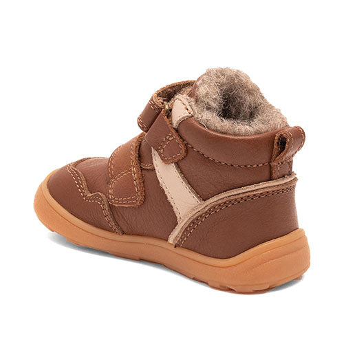 Lækker og vandtæt Becky Tex prewalker vinterstøvle med en overdel af LWG-certificeret glat skind med en let konstruktion, der følger fodens naturlige bevægelser, og snuden er forstærket med gummi. En fast hælkappe positionerer fødderne korrekt i støvlen og giver stabilitet omkring anklen. Indvendig har støvlen et blødt og naturligt varmeregulerende uldfoer, og sammen med en åndbar og vandtæt TEX-membran holdes fødderne tørre og varme i vintervejret. Støvlen lukkes med to velcroremme, og åbningen er polstret for øget komfort og beskyttelse, imens den brede tåboks giver god plads til tæerne og fremmer en sund fodstilling. Den udtagelige indersål beklædt med uld er ergonomisk formet efter fodens naturlige konturer, sikrer optimal støtte og komfort og kan nemt tages ud for lufttørring eller justering efter behov. Den fleksible gummiydersål er stødabsorberende med et godt fodfæste. Denne støvle er en barefoot-model, hvor den flade sål uden hældrop fremmer en naturlig gang og giver en forbedret ankelstabilitet samt balance, samtidig med at den fleksibelt følger fodens bevægelser.