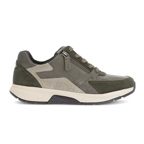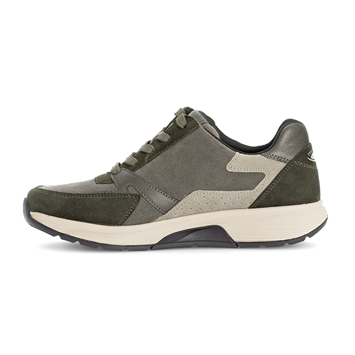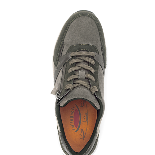 Lækker Rollingsoft sneaker med en overdel af ruskind, nubuck og glat skind i flotte grønne nuancer. Skoen justeres med snørebånd og lukkes med en lynlås på ydersiden af snørebåndet. Skoen har en 1,5 cm kilehæl. Den udtagelige indersål er polstret med en smule pelotte, og gummiydersålen er stødabsorberende med et fint fodfæste. Fås i halve størrelser.