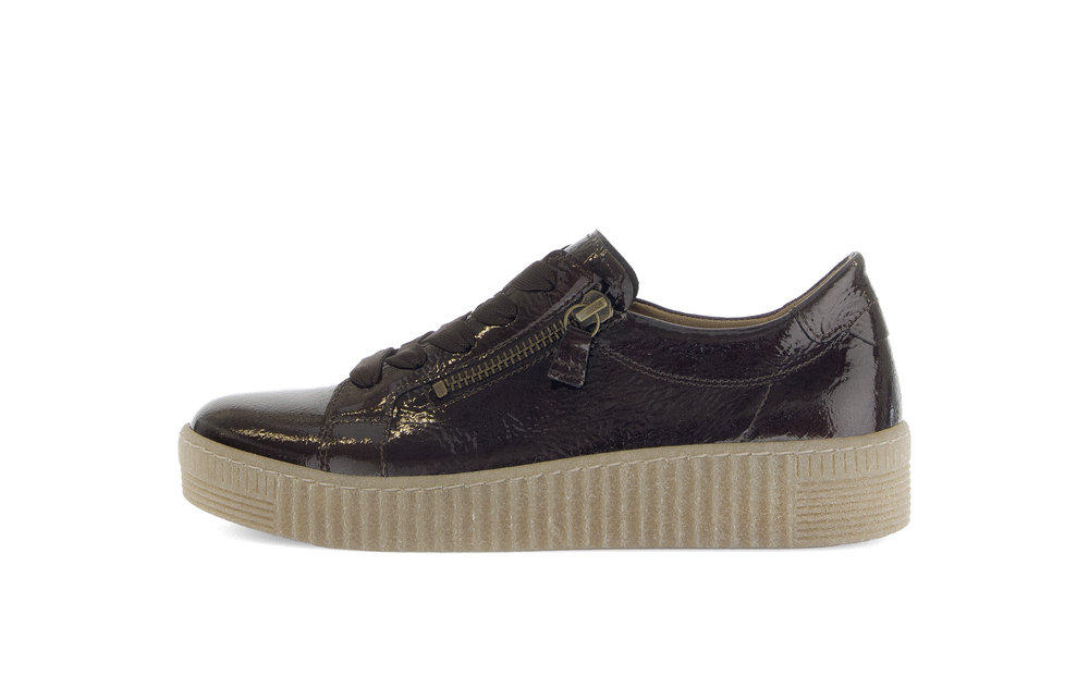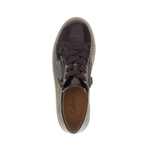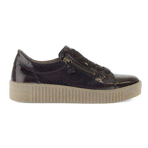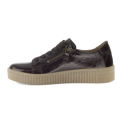 Lækker sko i court-stil med en overdel af lakeret skind. Skoen justeres med et bredt, blødt snørebånd og lukkes med to lynlåse på siderne af snørebåndet. Skoen har en 1,5 cm kilehæl. Den udtagelige indersål beklædt med skind er polstret og komfortabel, og den fleksible gummiydersål er stødabsorberende med et fint fodfæste. Fås i halve størrelser.