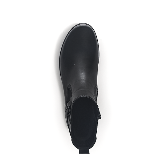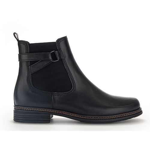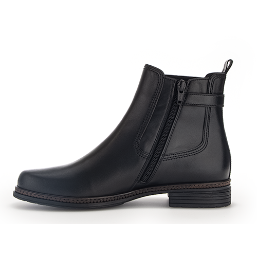 Flot ankelstøvle med en overdel af glat skind med et elastikpanel på ydersiden, dekoreret med en rem om anklen. Støvlen lukkes med en lynlås på indersiden af anklen og har en trækfane bagpå. Indvendig har støvlen et let, lunt tekstilfoer. Den udtagelige indersål er komfortabel og støddæmpende, imens gummiydersålen er stødabsorberende med et fint fodfæste. Fås i halve størrelser.