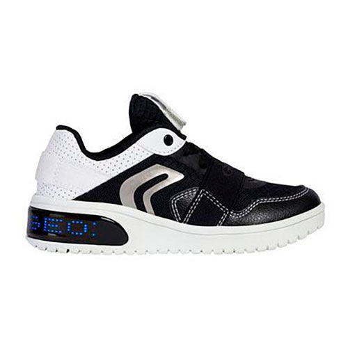 Super COOL sneaker fra Geox med bred elastik og snørebånd over foden. Modellen har LED-lys i sålen, med mulighed for selv at skrive hvilken tekst der skal vises (manual følger med i kassen). Udtagelig dæksål i tekstil. Alle Geox sko er åndbare gennem huller i sålen, hvor fugt kan komme ud, og frisk luft kan komme ind i skoen.
