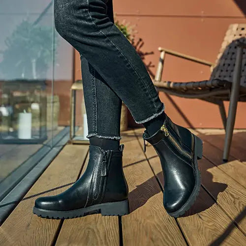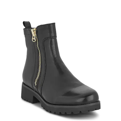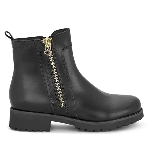 Lækker Strike Sigi ankelstøvle med en overdel af vegetabilsk garvet glat skind med en gylden lynlås på ydersiden af anklen og en sort lynlås på indersiden samt en trækfane bagpå. Indvendig har støvlen et fugttransporterende Soft Tex-foer, der lader dine fødder ånde og holder dem tørre hele dagen. Den udtagelige 3 mm EnergySole™-indersål med hælkop aktiverer de små muskler i dine fødder, giver optimal stødabsorbering og mindsker træthed. Modellen er skabt på den rummeligt H-læst, som giver mere plads om forfoden. Den fleksible og kraftige ydersål har et godt mønster og er stødabsorberende med et godt fodfæste.
