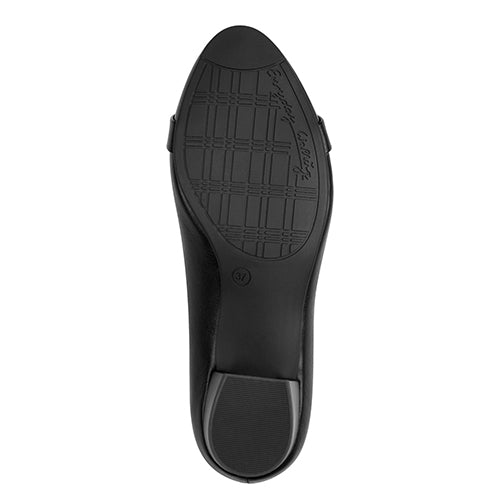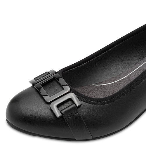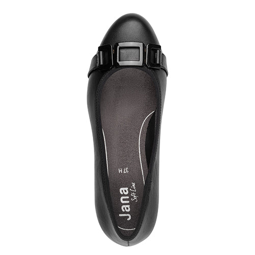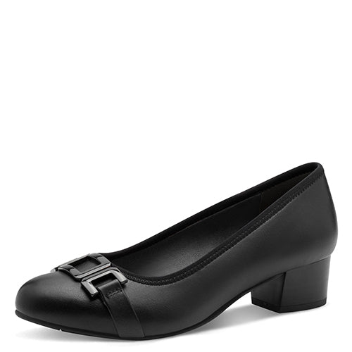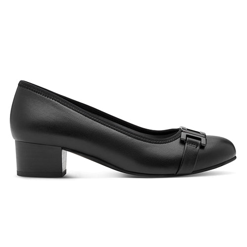 Flot pump med en overdel af syntet foret med tekstil, dekoreret med et blankt, sort "bidsel" på forfoden. Med vidde H er der plads til den bredere fod, og Soft Line-indersålen er blød og komfortabel. Den fleksible gummiydersål giver et fint fodfæste. 100 % vegansk.