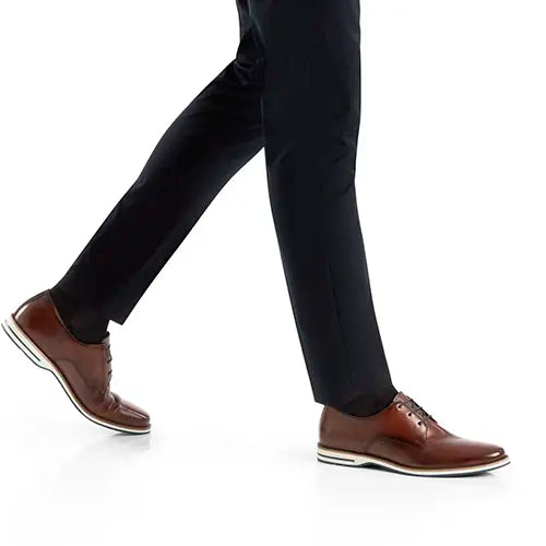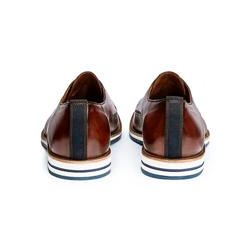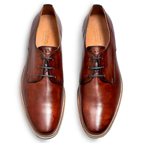 Klassisk og elegant Dakin sko med en overdel af glat læder med en stribe mørkeblåt tekstil på hælen. Skoen lukkes med snørebånd, og skindindersålen er polstret under hælen. Den fleksible gummiydersål med den karakteristiske røde Lloyd-stribe under hælen er stødabsorberende med et fint fodfæste. Fås i halve størrelser.