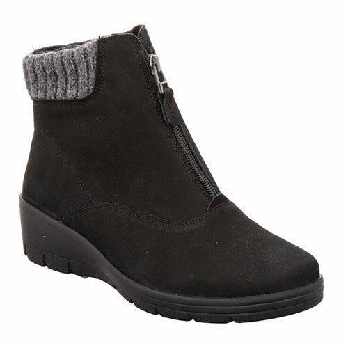 Dejlig støvle med en overdel af nubuck og en strikket tekstilkant om åbningen. Støvlen lukkes med en lynlås på vristen. Indvendig har støvlen et blødt, lunt fleecefoer, og den polstrede indersål kan tages ud. Den fleksible ydersål med kilehæl og gummibelægning under forfoden er stødabsorberende med et godt fodfæste.