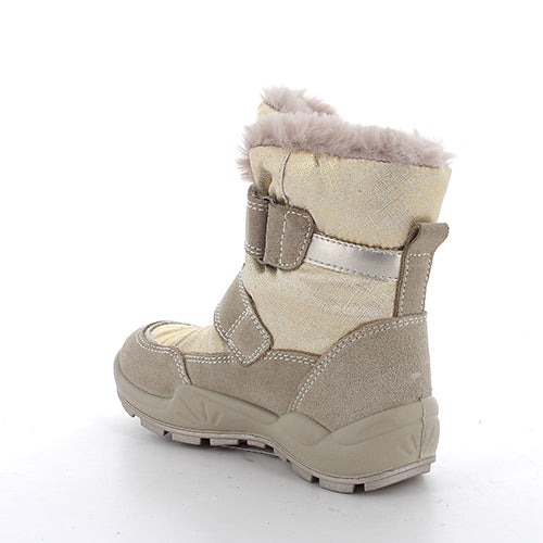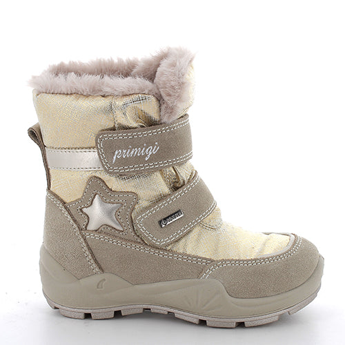 Superflot vinterstøvle med en overdel af ruskind og guldmetallisk syntet (lamineret tekstil), dekoreret med et stjernemotiv på ydersiden. Skaftets inderside er beklædt med blød, imiteret pels, som er synlig om åbningen. Støvlen lukkes med to justerbare velcroremme, og en trækfane bagpå gør det nemt at træde i støvlen. Indvendig har støvlen et varmt foer af Gore-Tex-uld, og sammen med en åndbar og 100 % vandtæt Gore-Tex-membran holdes fødderne varme og tørre i vintervejret. Den udtagelige indersål er beklædt med uld, og den fleksible ydersål er stødabsorberende med et godt fodfæste.