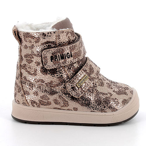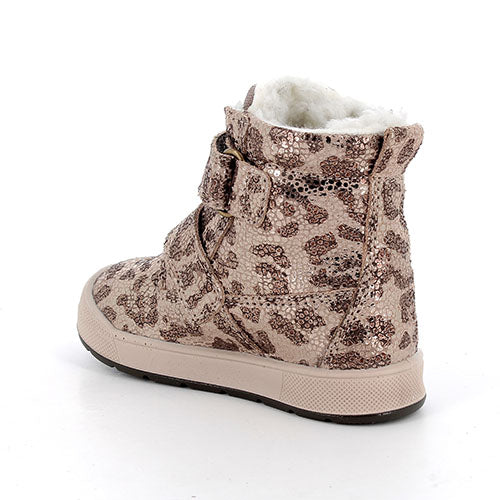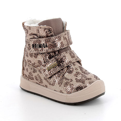 Dejlig vinterstøvle med en overdel af lamineret ruskind med tryk (dyreprint) og en pløs med tekstil. Støvlen lukkes med to velcroremme, og en trækfane bagpå hjælper med at træde i støvlen. Indvendig har støvlen et varmt uldfoer, og sammen med en åndbar og vandtæt GORE-TEX®-membran holdes fødderne varme og tørre. Den udtagelige indersål med filt er åndbar og anatomisk, og den fleksible ydersål er stødabsorberende med et fint fodfæste.