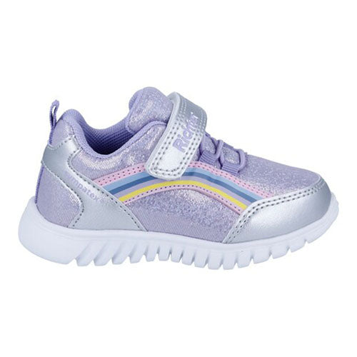 Smart og ultralet Wallaby sko med en overdel af tekstil og syntet med et skinnende look dekoreret med regnbuer på siderne. Skoen lukkes med en velcrorem over vristen, og et ikkejusterbart elastiksnørebånd hjælper med at holde skoen på plads. Åbningen er polstret for øget komfort, og en trækfane på hælen gør det nemt at træde i skoen. Indvendig har skoen et tekstilfoer, og med en åndbar Sympatex®-membran holdes fødderne tørre i vådt vejr. Den formstøbte og komfortable indersål kan tages ud, og den fleksible ydersål med riller er stødabsorberende med et godt fodfæste. Den patenterede og fleksible Roll-Off®-sål understøtter føddernes naturlige vækst og er usædvanligt let.