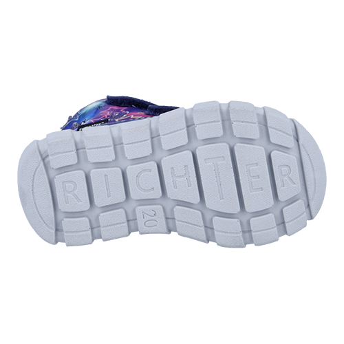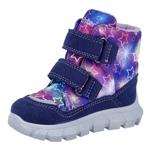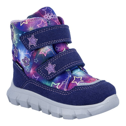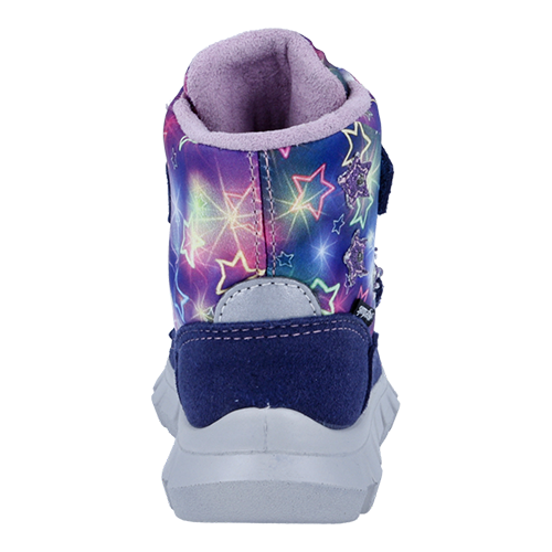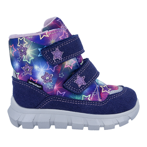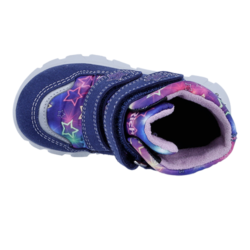 Dejlig og vandtæt vinterstøvle med LED. Overdelen er af syntet og tekstil med refleksdetaljer på snude og hæl og tre stjerner med LED-lys på ydersiden af anklen, der blinker, når støvlen rammer jorden. Støvlen lukkes med to velcroremme, og åbningen er polstret for øget komfort. Indvendig har støvlen et blødt, varmt foer, og sammen med en åndbar, 100 % vandtæt og PFAS-fri Sympatex®-membran holdes fødderne varme og tørre. Indersålen kan tages ud, og den fleksible ydersål er stødabsorberende med et godt fodfæste.