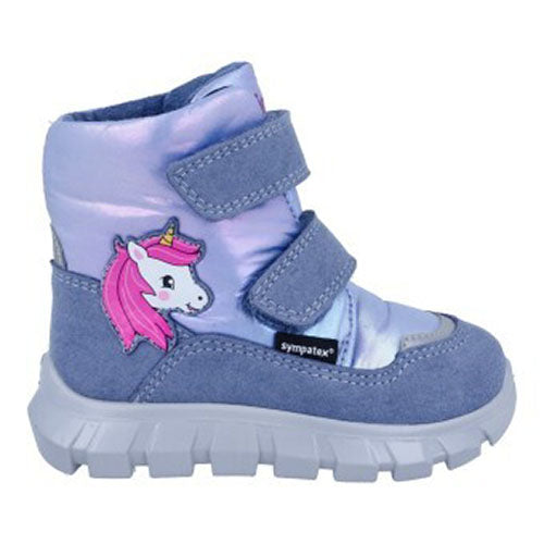Dejlig og vandtæt vinterstøvle med varmt foer. Overdelen af syntet og tekstil changerer i flere farver og har refleksdetaljer på snude og hæl samt et enhjørningehoved på ydersiden af hælen. Støvlen lukkes med to velcroremme, og åbningen er polstret for øget komfort. Indvendig har støvlen et blødt, varmt foer, og sammen med en åndbar, 100 % vandtæt og PFAS-fri Sympatex®-membran holdes fødderne varme og tørre. Indersålen kan tages ud, og den fleksible ydersål er stødabsorberende med et godt fodfæste.