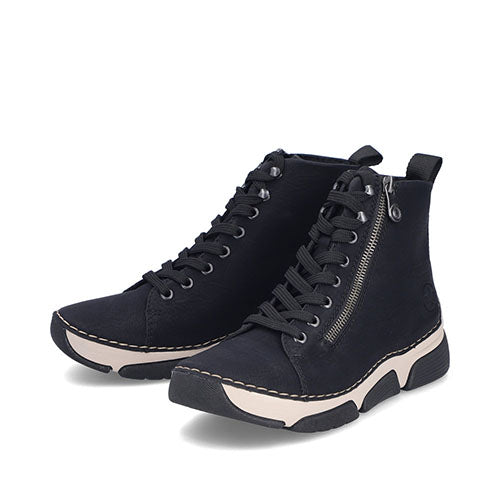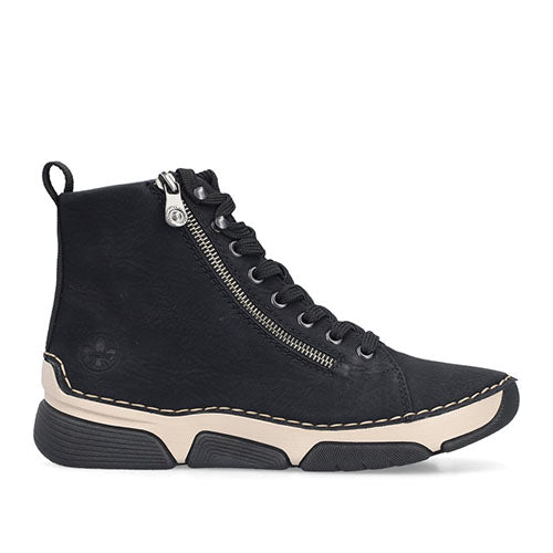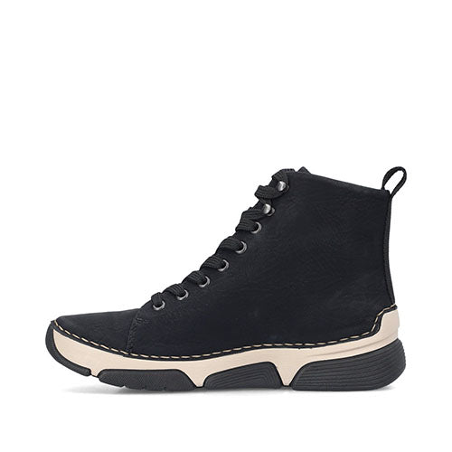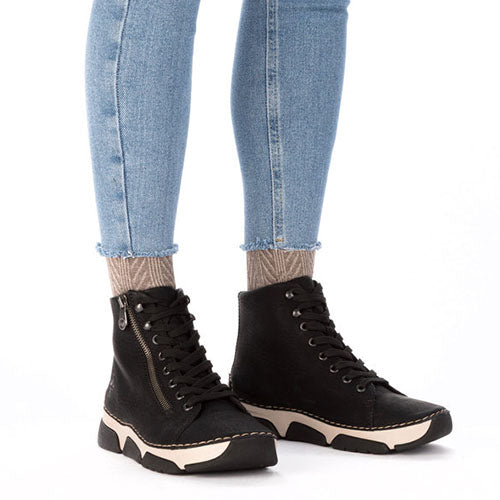 Dejlig ankelstøvle med en overdel af syntet. Støvlen justeres med snørebånd og lukkes med en lynlås på ydersiden af foden, imens en trækfane bagpå gør det nemt at træde i støvlen. Indvendig har støvlen et blødt, let fleecefoer, og indersålen er komfortabel. Den flotte, beige mellemsål med en beige randstikning giver støvlen et sporty udtryk, og den fleksible ydersål er stødabsorberende med et godt fodfæste.