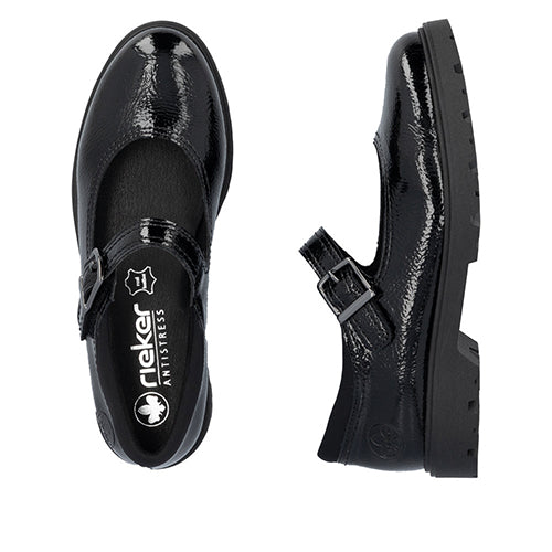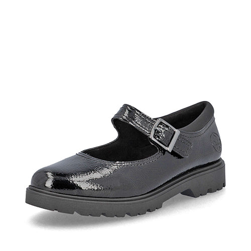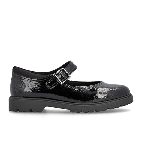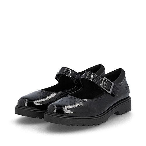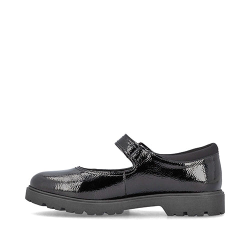 Smart Mary Jane-sko med en overdel af lakeret syntet og en polstret tekstilåbning. Skoen lukkes med en velcrorem med pyntespænde. Den polstrede indersål er beklædt med skind, og den kraftige gummiydersål er stødabsorberende med et godt fodfæste.