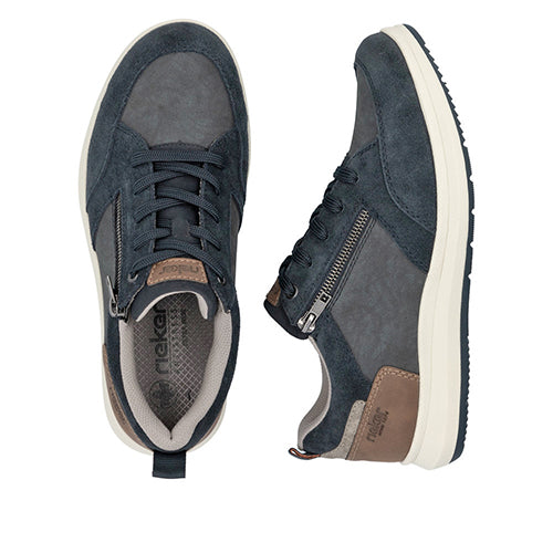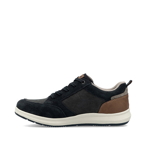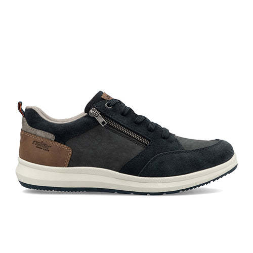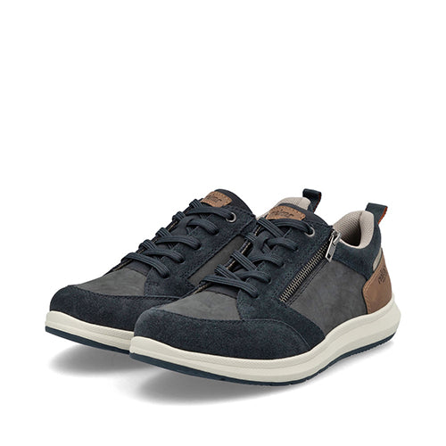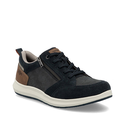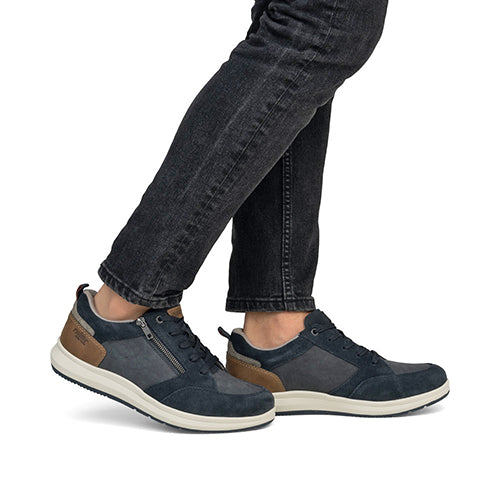 Dejlig sneaker med en overdel af skind og syntet. Skoen justeres med snørebånd og lukkes med en lynlås på ydersiden af foden, imens en trækfane på hælen gør det nemt at træde i skoen. Åbningen er polstret for øget komfort, og indersålen kan tages ud. Med ekstra vidde er der god plads om forfoden. Den fleksible ydersål er stødabsorberende med et godt fodfæste.