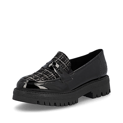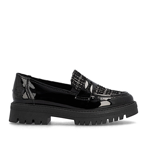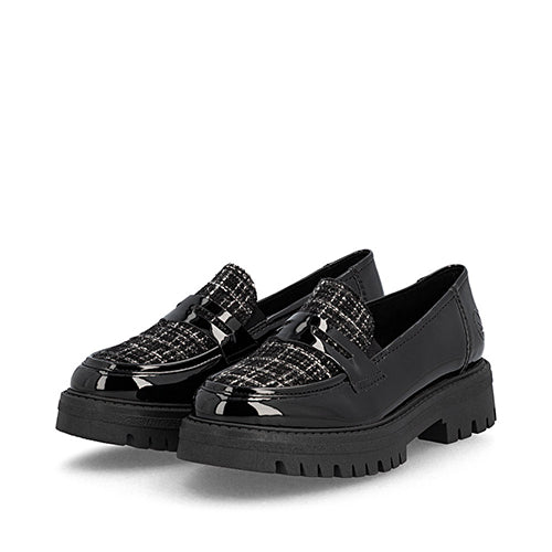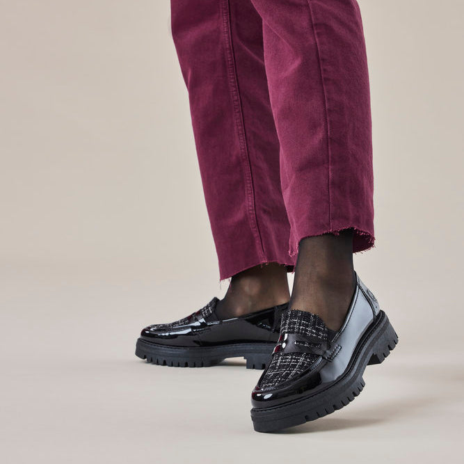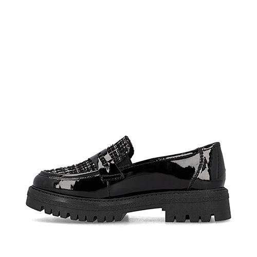 Flot loafer med en overdel af lakeret syntet og tekstil. Elastikkiler i åbningen gør skoen nem at træde i og sørger samtidig for løbende tilpasning til foden. Den komfortable Antistress-indersål er beklædt med skind, og den stødabsorberende gummiydersål giver et godt fodfæste. Ydersålen er chunky med en højde på ca. 3 cm under forfoden og ca. 4 cm under hælen. Disse loafers er perfekte til både hverdag og pænere anledninger.