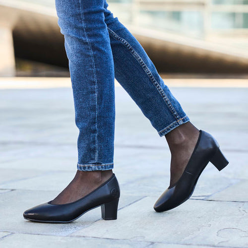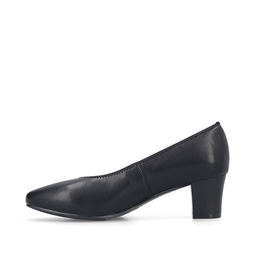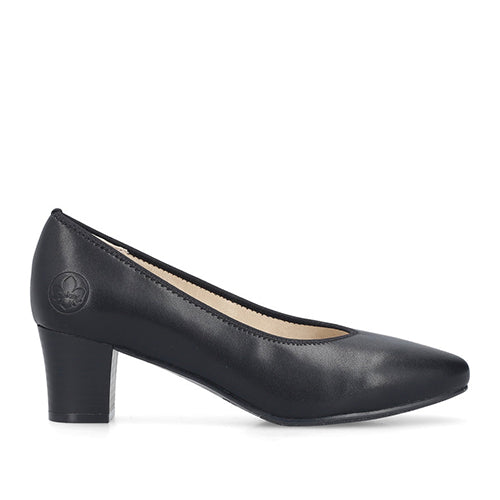Klassisk pump med en overdel af glat skind præget med et Rieker-logo på ydersiden af hælen. Den komfortable Antistress-indersål er beklædt med skind, og den flotte hæl understreger det feminine look. Her får du en sko, der føles let og fleksibel hele dagen.