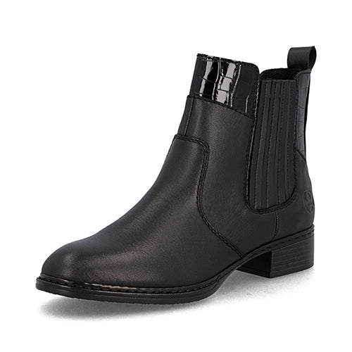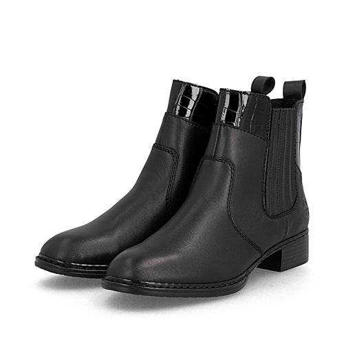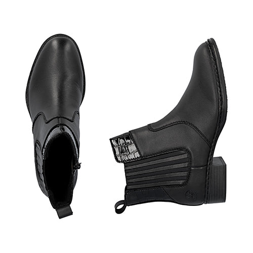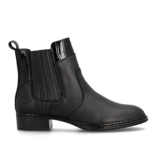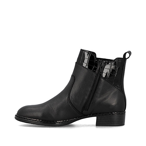 Klassisk ankelstøvle med smarte detaljer. Overdelen er af glat skind med krokopræget syntet om åbningen og et beklædt elastikpanel på ydersiden samt en trækfane bagpå. Støvlen lukkes med en lynlås på indersiden af anklen. Indvendig har støvlen et blødt, let og lunt fleecefoer, og indersålen er komfortabel. Ydersålen er fleksibel, og blokhælen giver et lille løft.