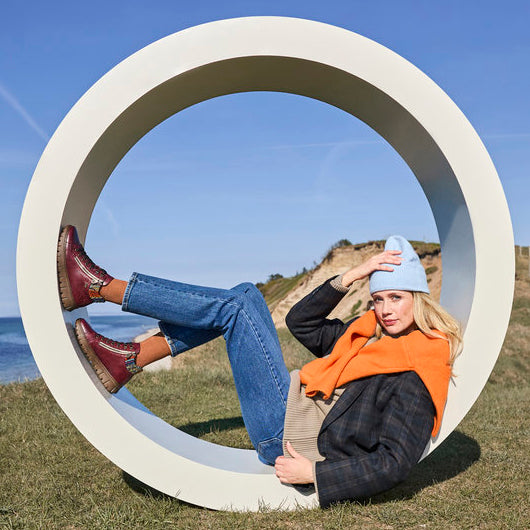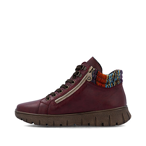 Lækker ankelstøvle med en overdel af glat skind og en flot krave af farverigt garn. Støvlen justeres med snørebånd og lukkes med lynlås på hver side af snørebåndet. Indvendig har støvlen et blødt, lunt foer, og sammen med en kraftigt vandafvisende Rieker-Tex-membran holdes fødderne lune og tørre. Med vidde H er der plads til den bredere fod. Den udtagelige indersål er støddæmpende og komfortabel, og den fleksible ydersål er stødabsorberende med et godt fodfæste.
