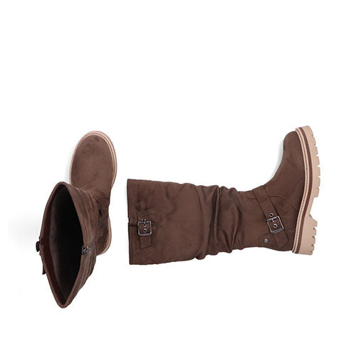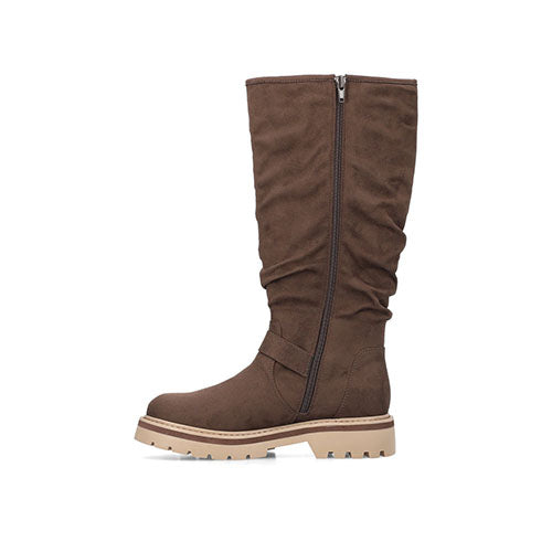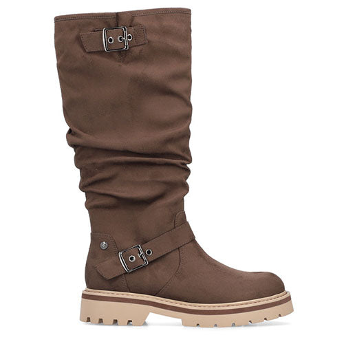 Flot langskaftet støvle med en overdel af blødt tekstil i et smart, rynket design, dekoreret med to spænder på ydersiden af henholdsvis skaftet og anklen. Støvlen lukkes med en lynlås på indersiden af benet. Indvendig har støvlen et blødt, let og lunt foer, og indersålen er komfortabel. Den kraftige ydersål har et godt mønster og er stødabsorberende med et godt vejgreb.
