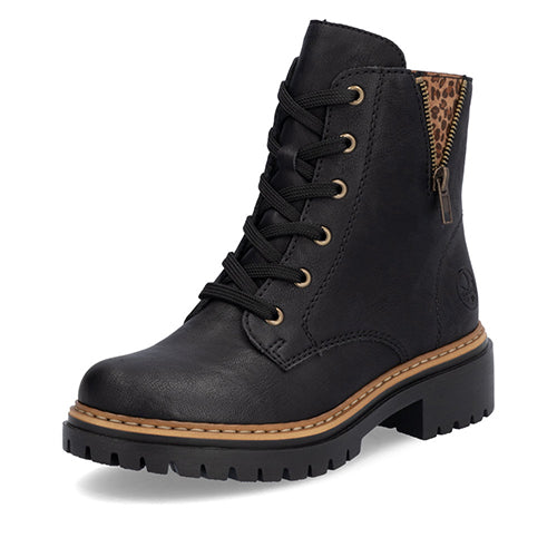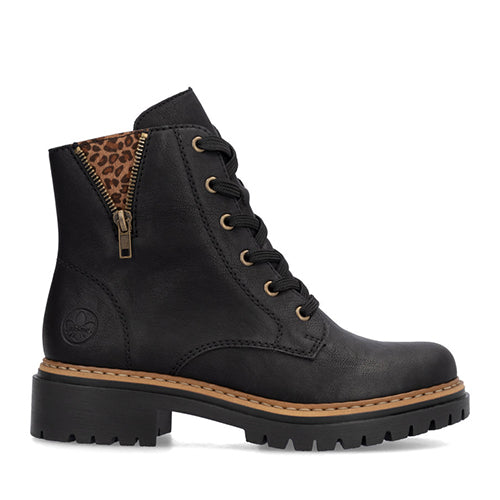 Smart støvle med en overdel af imiteret glat skind dekoreret med en lille, åben lynlås, der afslører leopardprint på ydersiden af anklen. Støvlen justeres med snørebånd og lukkes med en lynlås på indersiden af anklen. Indvendig har støvlen et let, lunt foer. Den kraftige ydersål er stødabsorberende med et godt fodfæste.