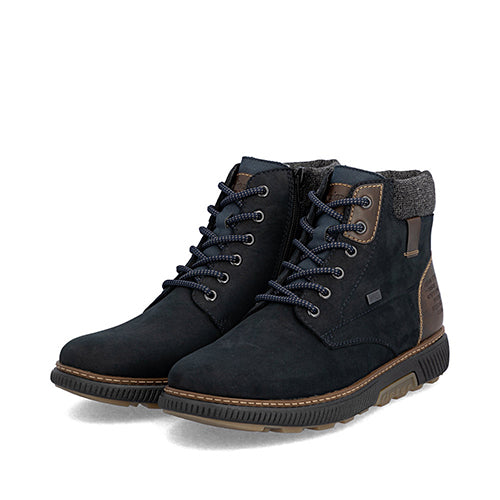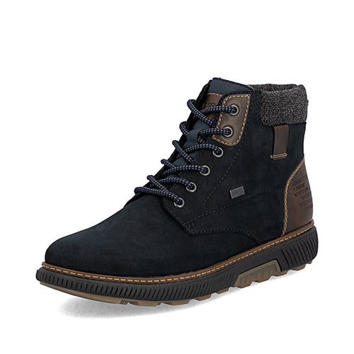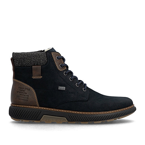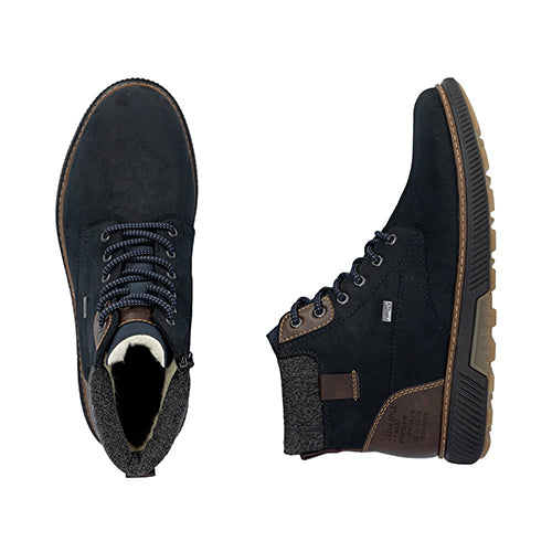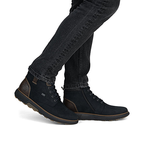 Dejlig ankelstøvle med varmt foer og Rieker-Tex. Overdelen er af nubuck og syntet, og indvendig har støvlen et varmt foer, der sammen med en kraftigt vandafvisende Rieker-Tex-membran sørger for varme og tørre fødder. Støvlen justeres med snørebånd og lukkes med en lynlås på indersiden af anklen. Åbningen er polstret for øget komfort, og med vidde H er der plads til den bredere fod. Den udtagelige indersål er polstret, støddæmpende og komfortabel, og den fleksible gummiydersål er stødabsorberende med et godt fodfæste.