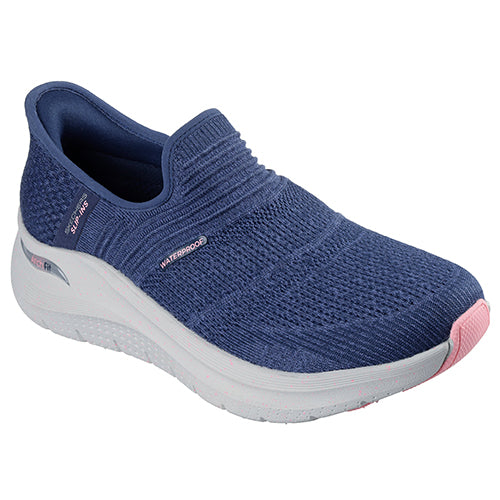 Vandtæt Slip-ins Arch Fit 2.0 - Right As Rain sko med svangstøtte. Overdelen er af let og åndbart striktekstil i en flot denimblå farve, og med Stretch Fit tilpasser skoen sig foden som en strømpe. Med Skechers Hands Free Slip-ins-teknologien kan du nemt træde i skoen uden at bukke dig eller bruge dine hænder. Designet med en komfortabel Heel Pillow, som former sig efter din hæl og holder din fod sikkert på plads. Indvendig har skoen et let Skechers Breathe Easy Technology-foer, som giver 100 % vandtæt beskyttelse samtidig med maksimal åndbarhed. Den udtagelige Arch Fit-indersål giver god svangstøtte og maksimal komfort og hjælper med at forme sig efter din fod for at reducere stød og øge vægtfordelingen. Mellemsålen er stødabsorberende, og den fleksible ydersål med gummi på hæl og tå er stødabsorberende med et godt fodfæste. Her får du en smart, praktisk og komfortabel sko, perfekt til dagligdagen. Skoen er fremstillet af 100 % veganske materialer.