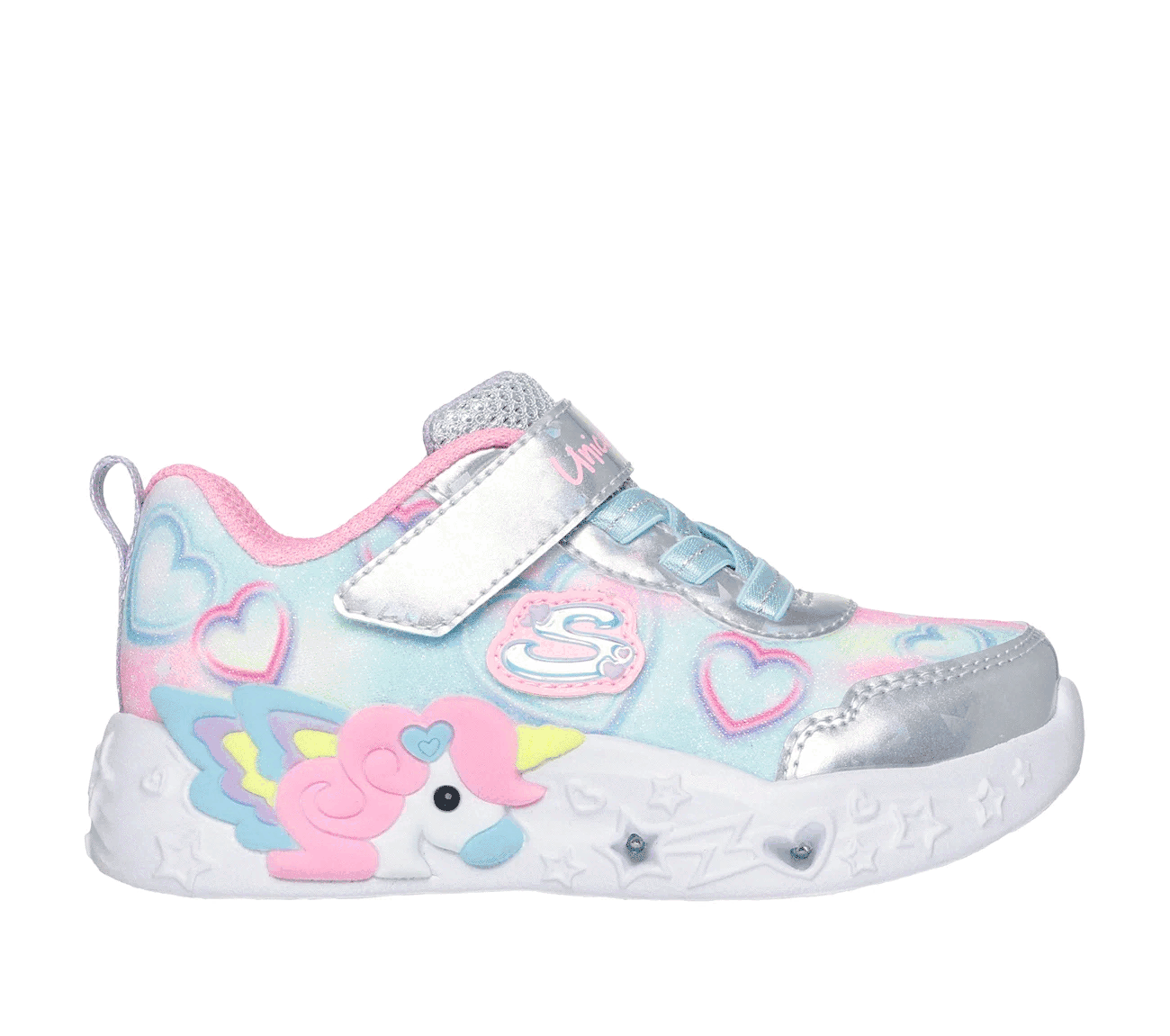 Superfin S Lights - Unicorn Charmer - Lil Heart Sparkles sko med blink, enhjørning og hjerter. Overdelen er af glittertekstil og syntet, dekoreret med hjerter. Skoen lukkes med en velcrorem over vristen, imens en ikkejusterbar elastiksnøre sørger for tilpasning til foden i løbet af dagen. En trækfane på hælen gør det nemt at træde i skoen, og åbningen er polstret for øget komfort og beskyttelse. Indersålen er komfortabel, og den stødabsorberende ydersål er dekoreret med et enhjørningehoved og har fire blinkende lys.