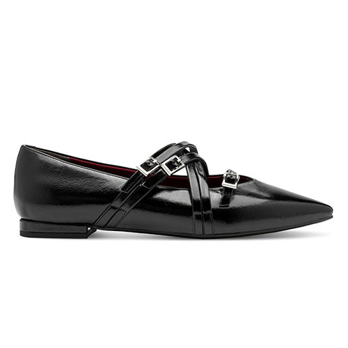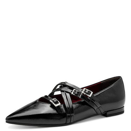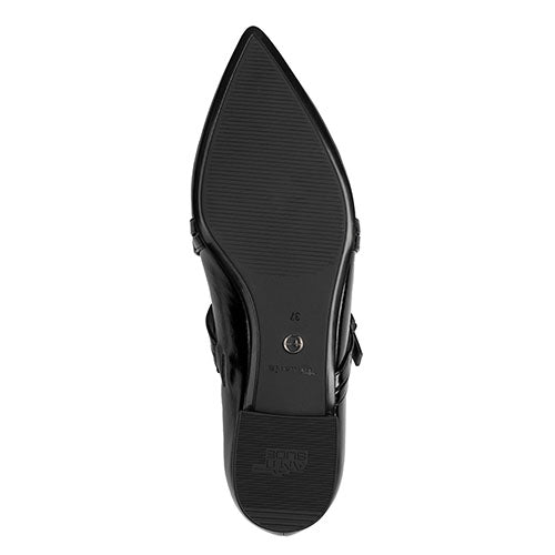 Flot sko med spids snude og 5 smalle remme over vristen. Overdelen er af lakeret syntet foret med tekstil. Skoen lukkes med tre smalle remme med spænde. Touch-it-indersålen er blød og polstret, og ydersålen har ANTIslide.