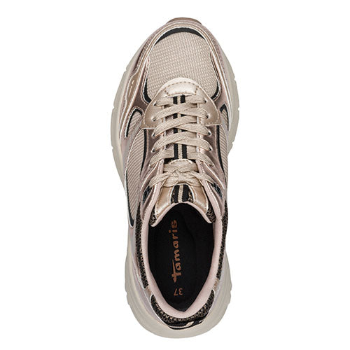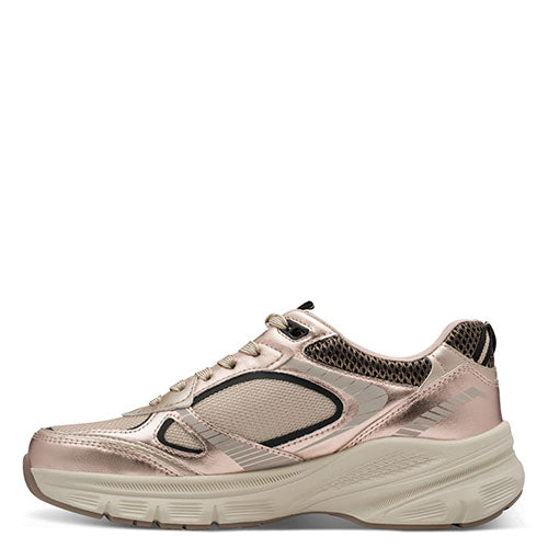 Lækker sneaker med en overdel af glittertekstil og metallisk syntet i en flot farvekombination. Skoen lukkes med snørebånd, og trækfaner på hæl og pløs gør det nemt at træde i skoen. Åbningen er polstret for øget komfort. Den udtagelige indersål er polstret, blød, støddæmpende og komfortabel, og den kraftige EVA-ydersål med gummibelægning er stødabsorberende med et godt fodfæste. 100 % vegansk.