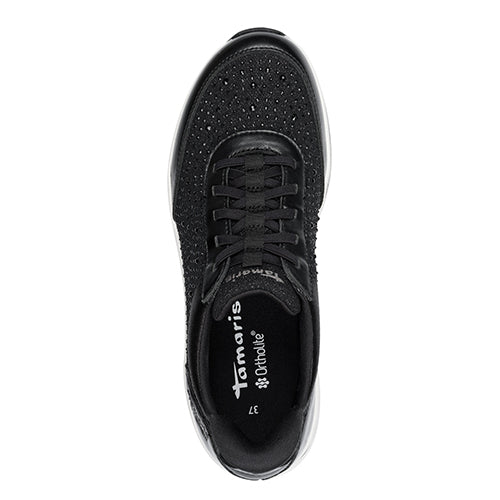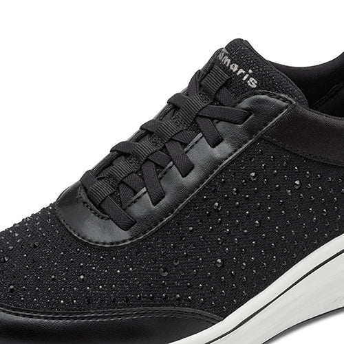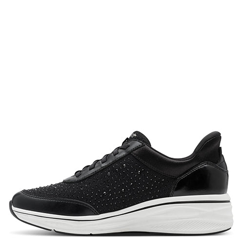 Smart STEP-IN sko med kilehæl og glittersten. Overdelen er af tekstil og imiteret glat skind, dekoreret med en masse små glittersten med facetter, der fanger lyset flot. Skoen er en STEP-IN-model med en ikkejusterbar elastiksnøre, og den udtagelige OrthoLite®-indersål lavet af et let, formstabilt materiale med fugtabsorberende egenskaber er støddæmpende og komfortabel. Mellem- og ydersålen er stødabsorberende, og gummibelægning på ydersålen forbedrer fodfæstet. En lille kilehæl øger det feminine look.