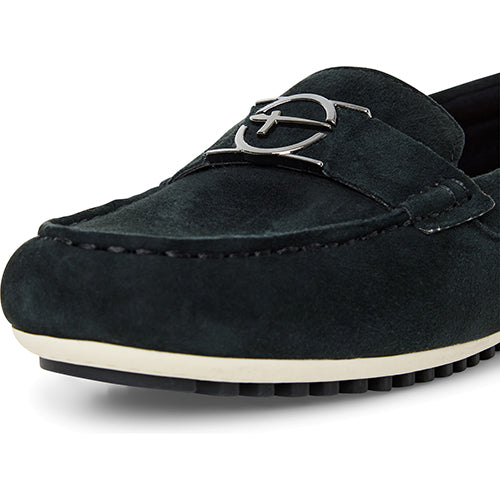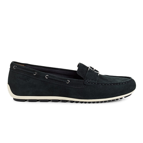 Lækker loafer med en overdel af ruskind med en rem med et mørkegråt metallogo, og kanten er dekoreret med et pyntebånd gennem metalfarvede øjer. Den udtagelige indersål er støddæmpende, polstret og komfortabel og beklædt med skind, og sammen med det bløde tekstilfoer får foden et godt klima. Den karakteristiske gummiydersål er meget fleksibel samt stødabsorberende med et godt vejgreb, og den er forlænget et stykke op ad hælen for ekstra slidstyrke. Skoen er meget let. Her får du et par loafers perfekt til både hverdag og fest.