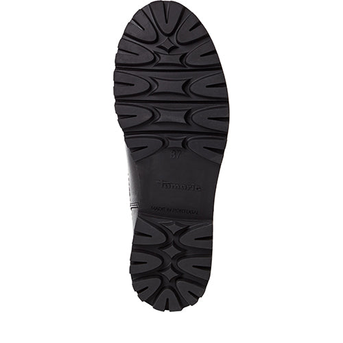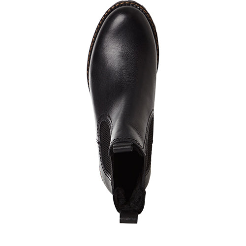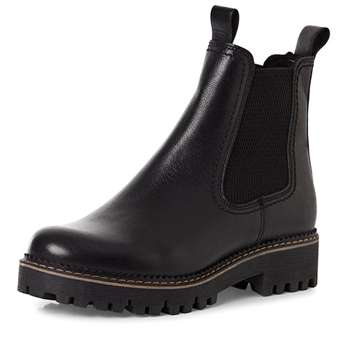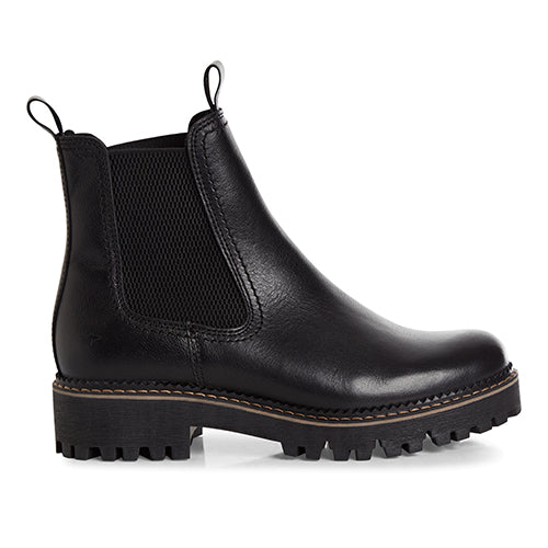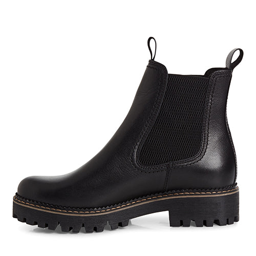 Lækker chelseastøvle med en overdel af glat skind og to elastikpaneler på siderne og trækfaner både for og bag. Indvendig har støvlen et varmt foer. Den udtagelige indersål er komfortabel, og den kraftige og dybt mønstrede gummiydersål er stødabsorberende med et godt fodfæste.