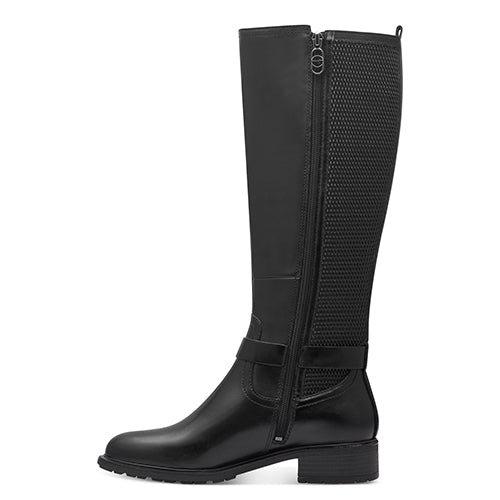 Lækker langskaftet støvle med et elastisk XL-skaft, der tilpasser sig bredere lægge. Overdelen er af glat skind og elastisk syntet dekoreret med en ankelrem og pyntespænde. Støvlen lukkes med en lynlås på indersiden. Indvendig på skinddelen har støvlen et let og lunt fleecefoer, og indersålen er komfortabel. Ydersålen og den 3,5 cm høje blokhæl belagt med gummi har et godt mønster for et forbedret fodfæste.