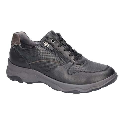 Lækker og komfortabel H-Max sko med en overdel af glat skind samt perforeret glat skind med en ruskindsdetalje på hælen. Skoen justeres med snørebånd og lukkes med en lynlås langs ydersiden af snørebåndet. Åbningen er polstret for øget komfort, og med vidde H er der plads til den bredere fod. Den udtagelige indersål er polstret, støddæmpende og komfortabel, imens PU-ydersålen har et godt fodfæste og er udstyret med en luftpudesål, som giver ekstra komfort og stødabsorbering. Fås i halve størrelser.
